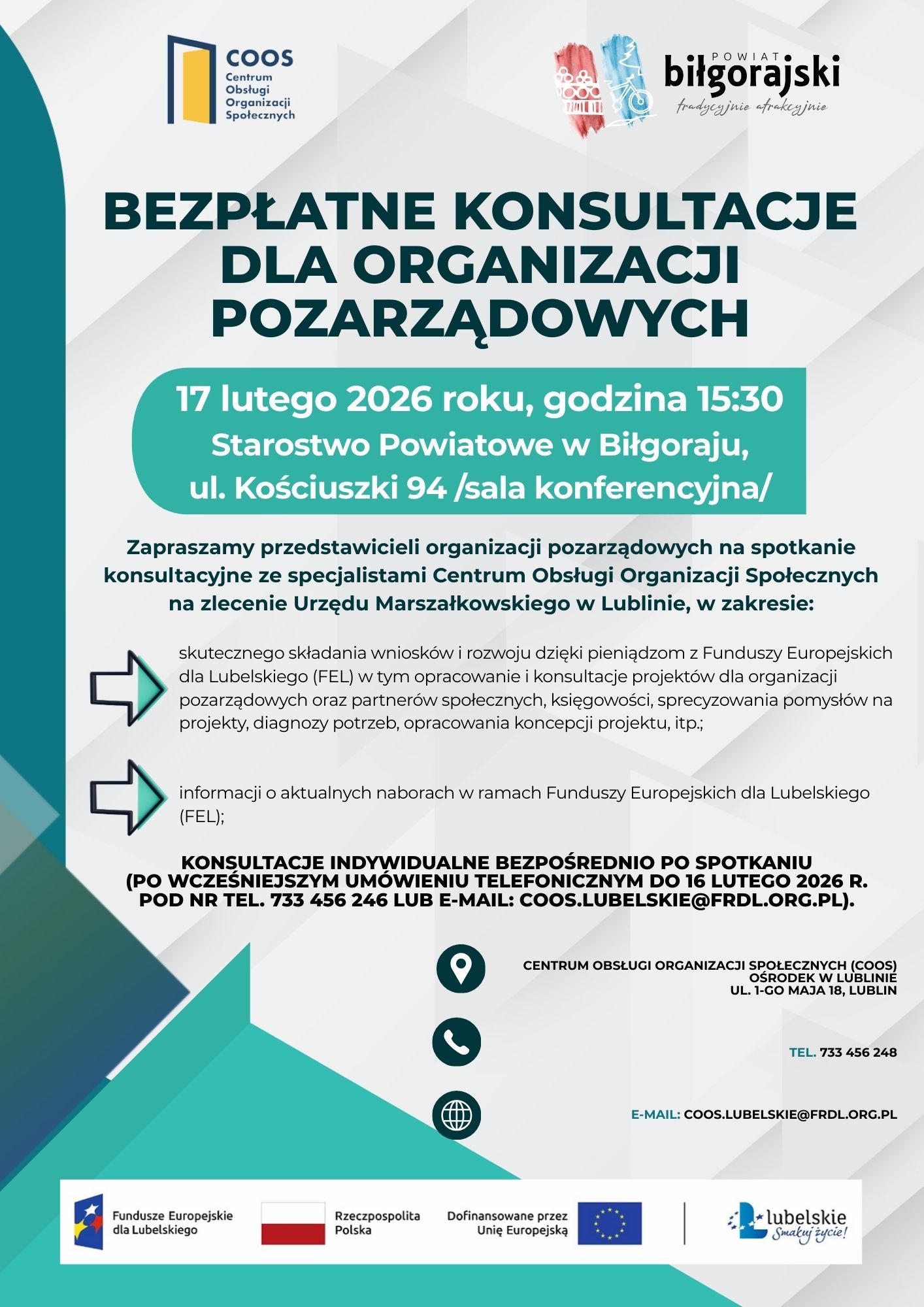 Centrum Obsługi Organizacji Społecznych wspólnie ze Starostwem Powiatowym w Biłgoraju zaprasza na bezpłatne spotkanie konsultacyjne: